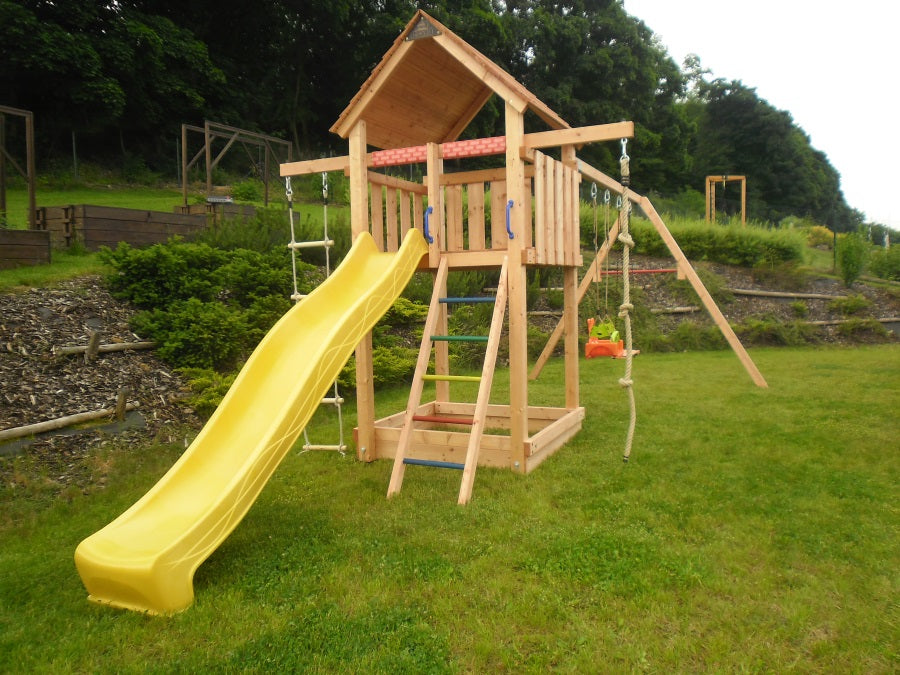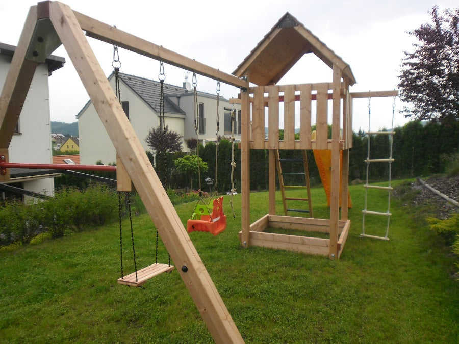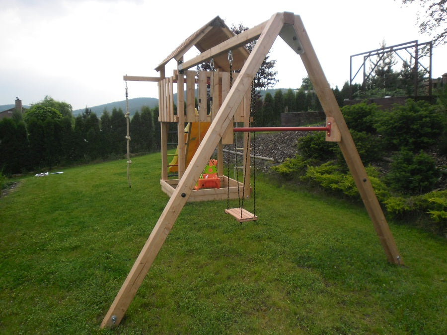 Děti si mohou užít skluzavku o délce 2,90 m (vyberte si ji v sekci související produkty), houpačku nebo provazový žebřík, které lze zavěsit na připravené háky se silonovým pouzdrem. Na druhou stranu visutého trámu lze upevnit šplhací lano, které je součástí dodávky, případně další herní prvky z naší nabídky.
