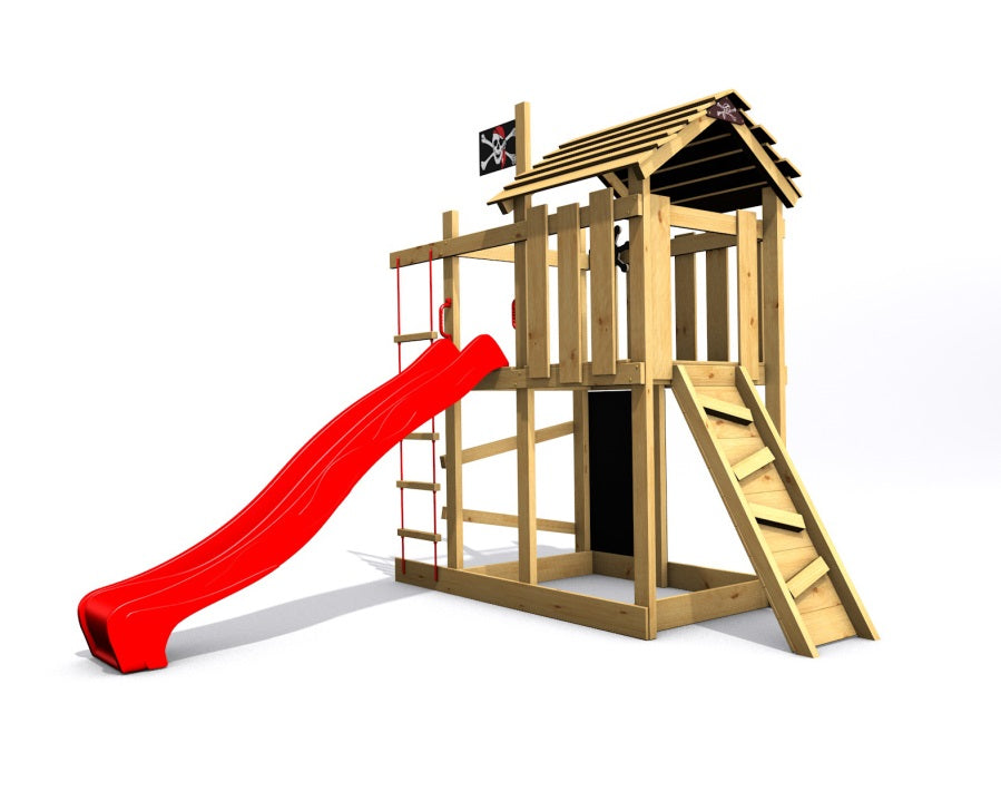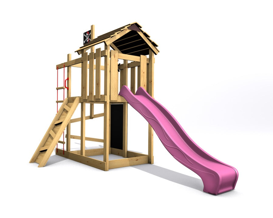 Naše hřiště zajistí Vašim dětem dlouhé chvíle zábavy se skluzavkou o délce 2,20m, svou kreativitu podpoří s kreslící tabulí a sílu natrénují na šikmé stěně a žebříku. Aby hřiště bylo kompletní nesmí chybět stožár s pirátskou vlajkou a dřevěné kormidlo :-)