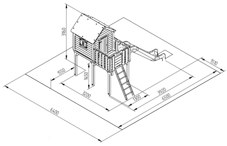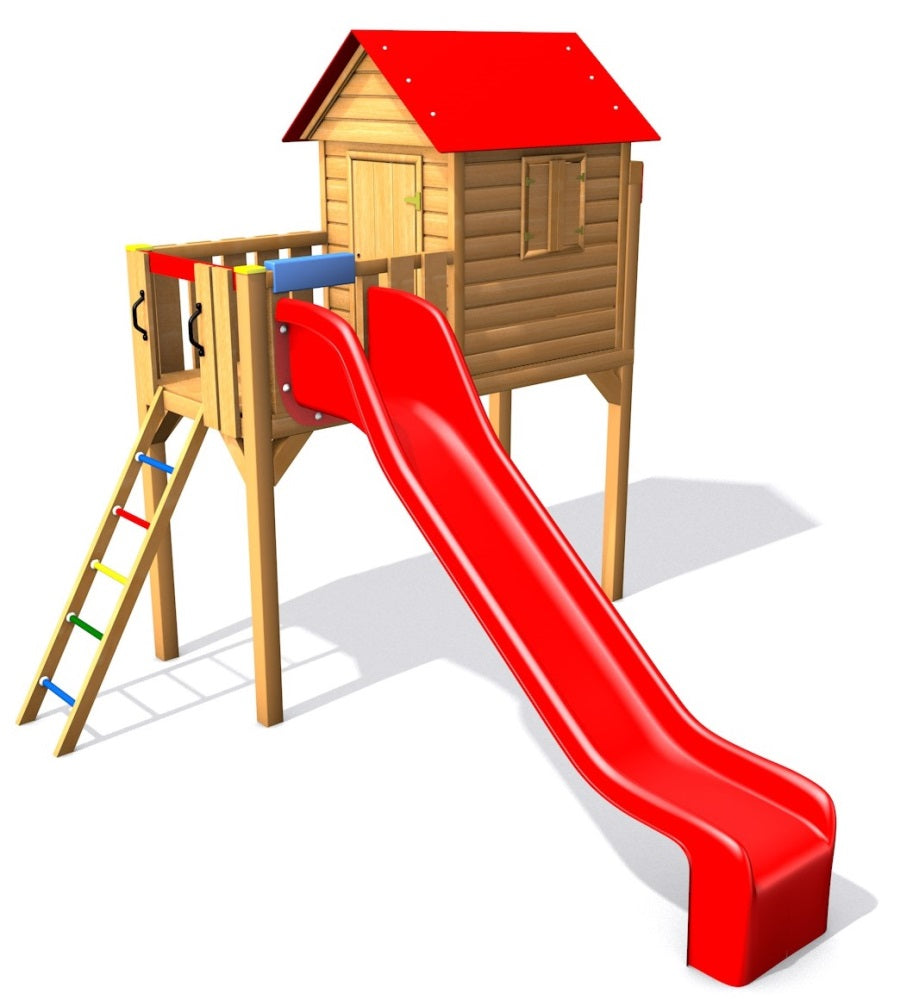 Sestava obsahuje: Dětský domek na vyvýšené podestě, 2x okno s okenicemi, 1x dveře bez možnosti uzamčení, 1x příčkový žabřík, veškeré kotvení, podložka ke skluzavce, 2x bezpečnostní ochraný profil.