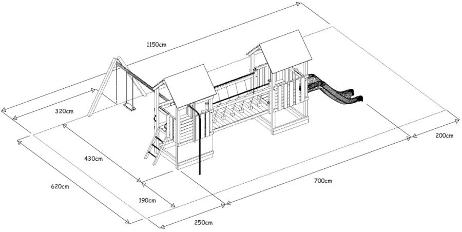 Sestava obsahuje – 2x věž se střechou, 1x houpací lávka, 1x šplhací tyč, 1x nástupní žebřík, 2x bezpečnostní polštářek, 1x ráhno k zavěšení houpačky, 1x houpačkový sedák.